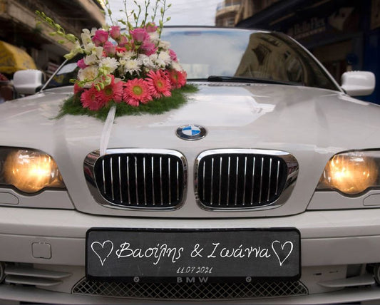 Πινακίδα αυτοκινήτου γάμου Ονόματα & ανθοδέσμη (2 τεμ)