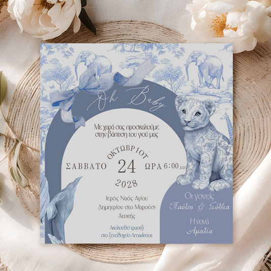 Προσκλητήριο Βάπτισης - Blue Toile Ζώα Της Ζούγκλας