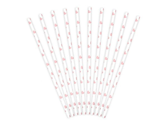 Καλαμάκια χάρτινα λευκά με ροζ καρδιές (10 τεμ)
