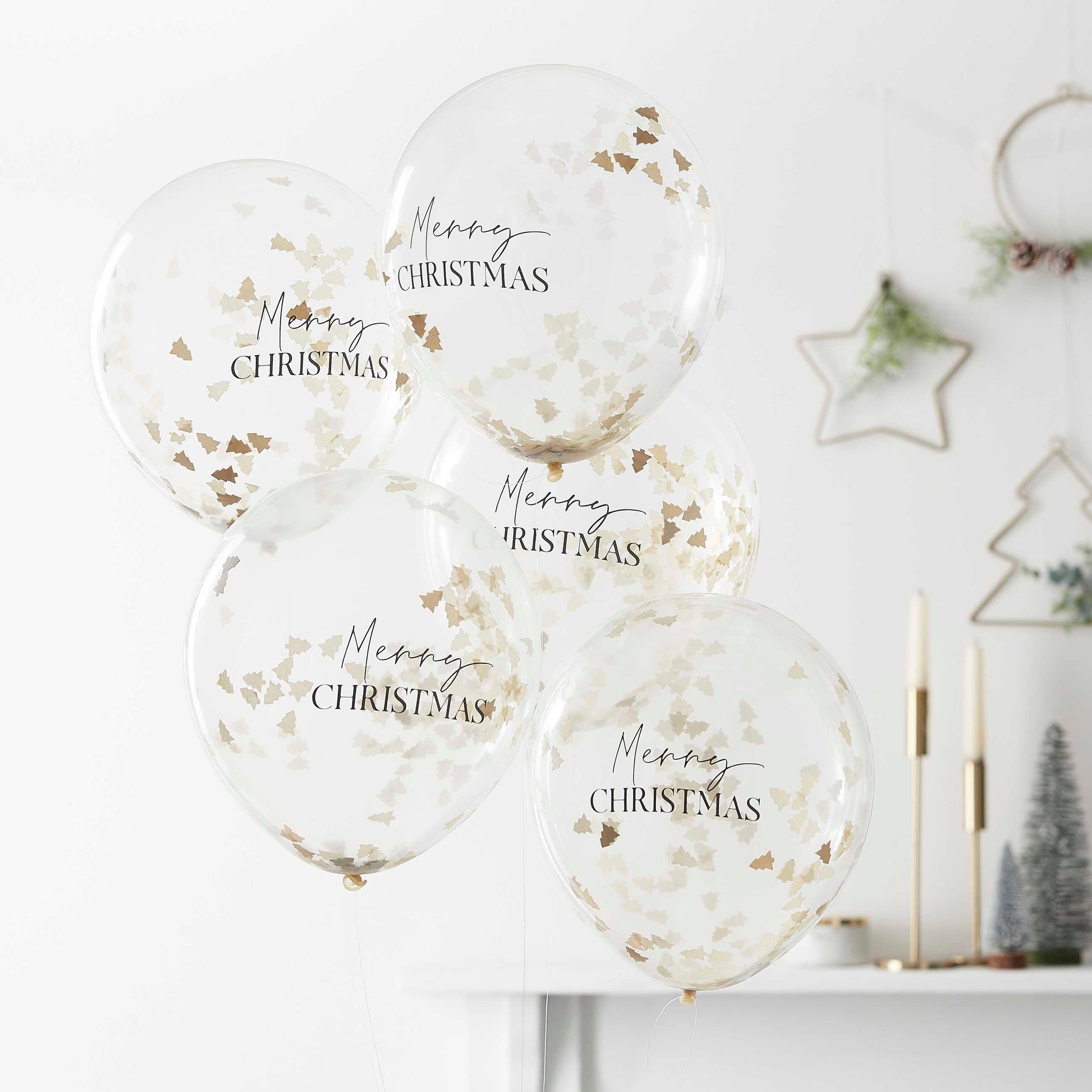 Αυτά τα ιδιαίτερα λαστιχένια μπαλόνια για ήλιον θα γίνουν η τελική πινελιά κομψότητας στη Χριστουγεννιάτικη διακόσμησή σας γιά το Χριστουγεννιάτικο πάρτι σας. Τα πανέμορφα χρυσά κομφετί σε σχήμα έλατου θα λάμπουν πίσω απο την επιγραφή 'Merry Christmas' πάνω στα μπαλόνια.