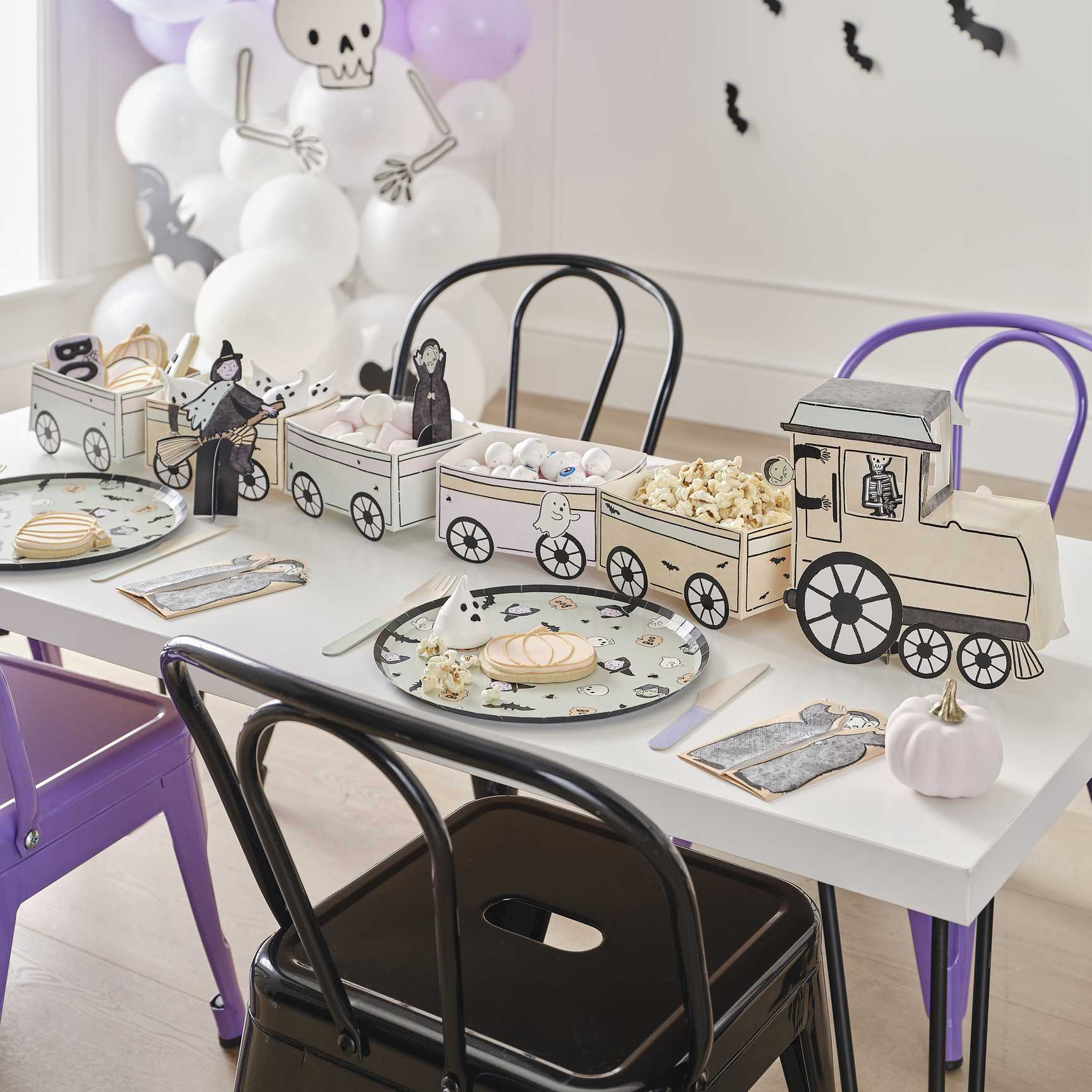 Προσθέστε την τελική πινελιά στο τραπέζι του Halloween πάρτι σας με αυτό το τρένο των φαντασμάτων γεμάτο με τα αγαπημένα σας... τρομακτικά γλυκά και τις 3D φιγούρες. Κάθε πακέτο περιέχει: