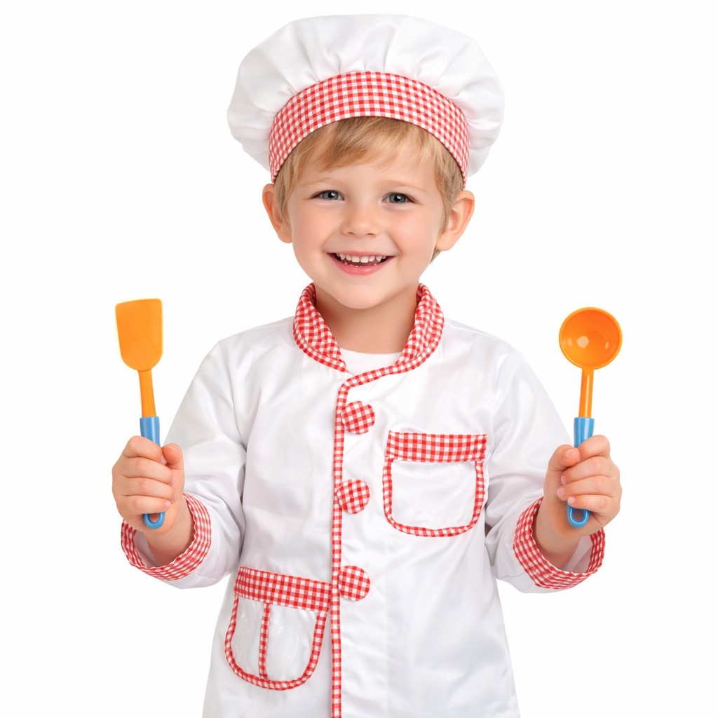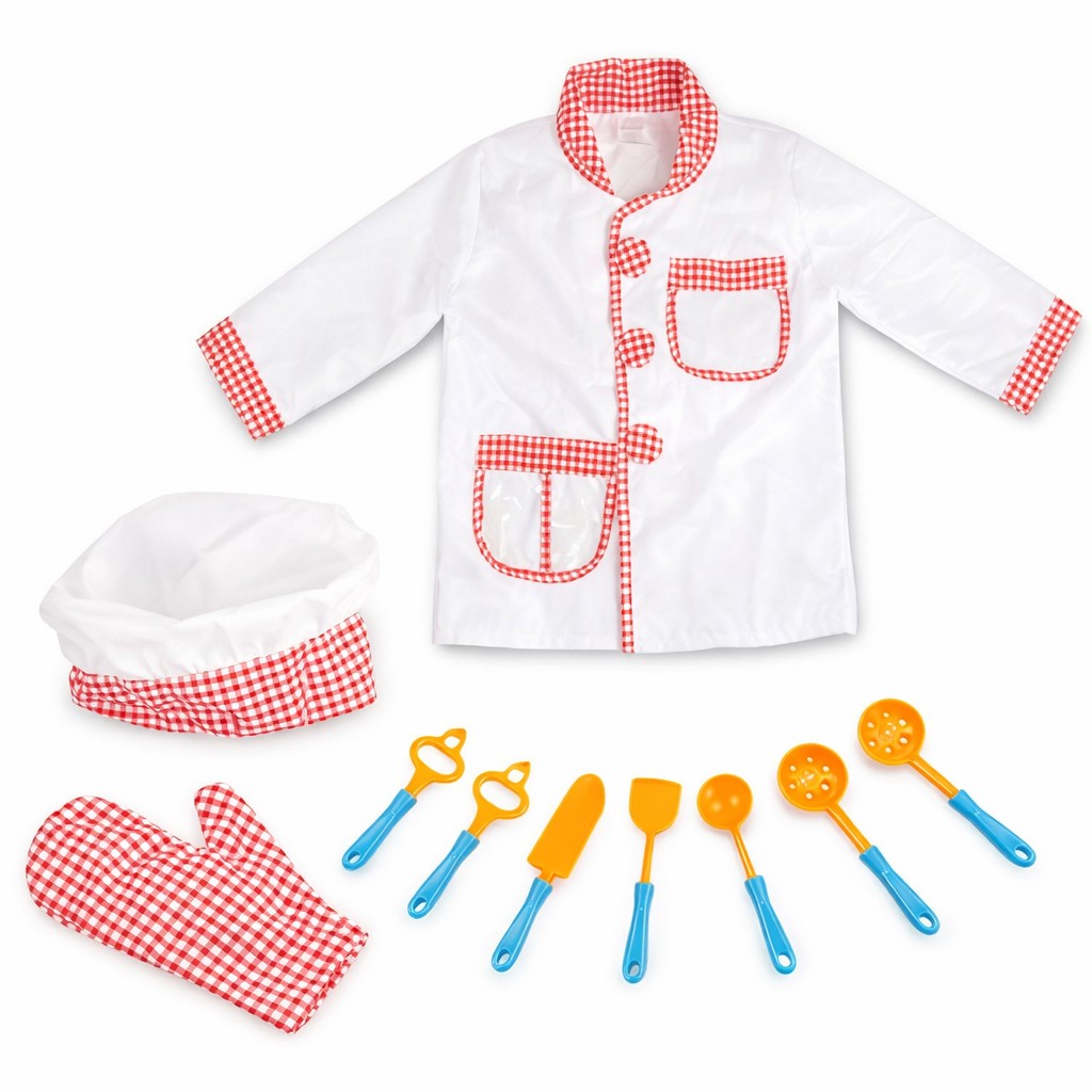 • Περιλαμβάνει: σακάκι με καρό γιακά, γάντι κουζίνας, σκουφάκι και εργαλεία μαγειρικής