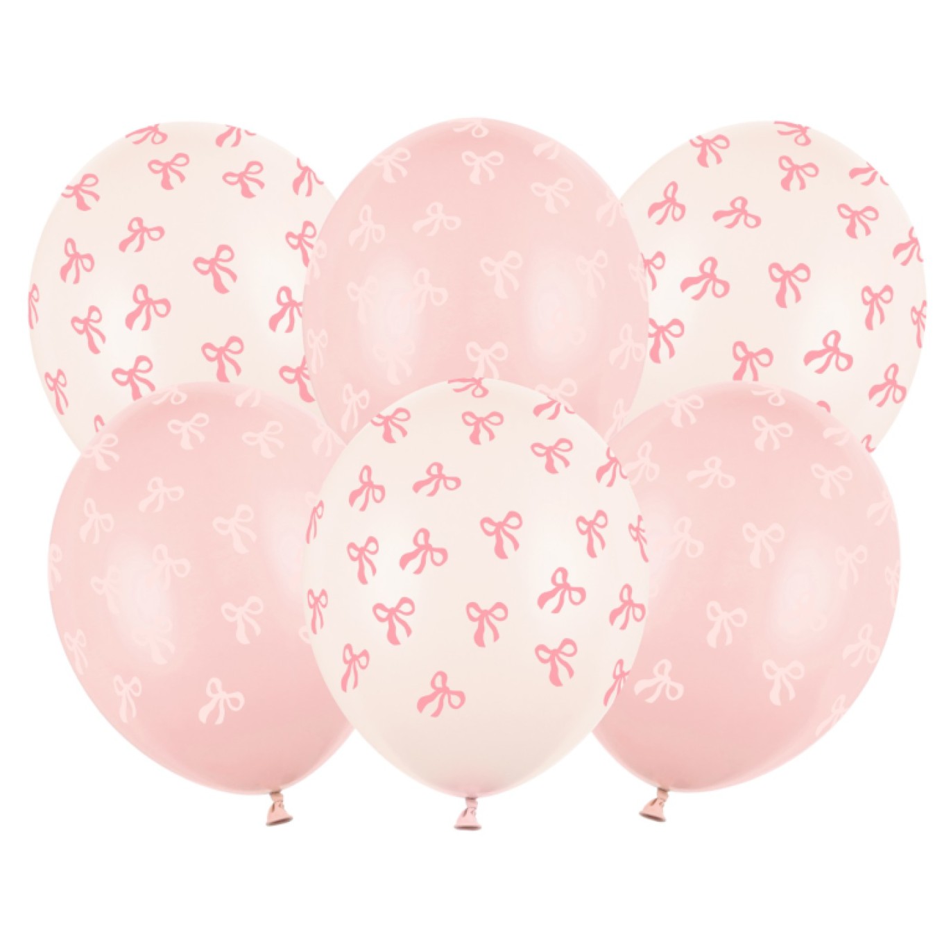 Λάτεξ μπαλόνια με τύπωμα ροζ φιογκάκια, σε παστέλ αποχρώσεις Light Cream και Baby Pink με εκτύπωση πέντε πλευρών. Ιδανικά για κομψή διακόσμηση σε baby shower, βαπτίσεις και παιδικά πάρτι.