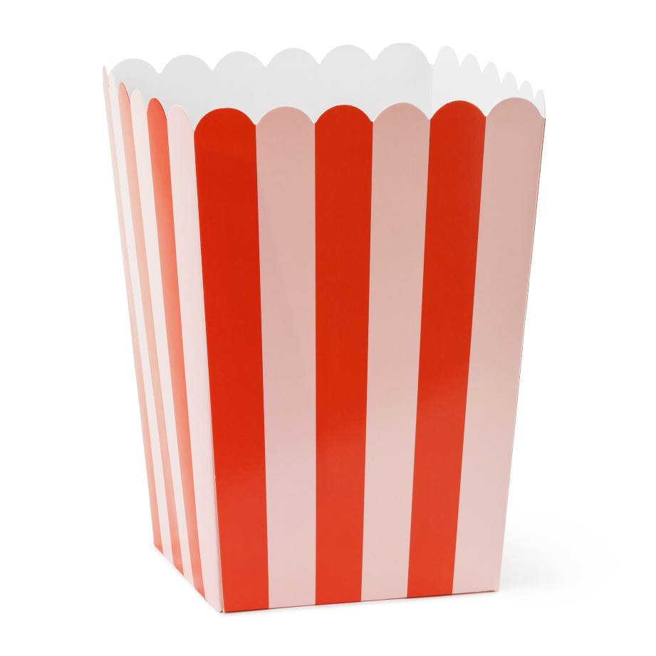 Κουτιά για ποπκόρν σε κόκκινο χρώμα με ροζ ρίγες, ιδανικά για πάρτι, κινηματογραφικές βραδιές ή θεματικά events, προσφέροντας πρακτική και διασκεδαστική παρουσίαση του σνακ.