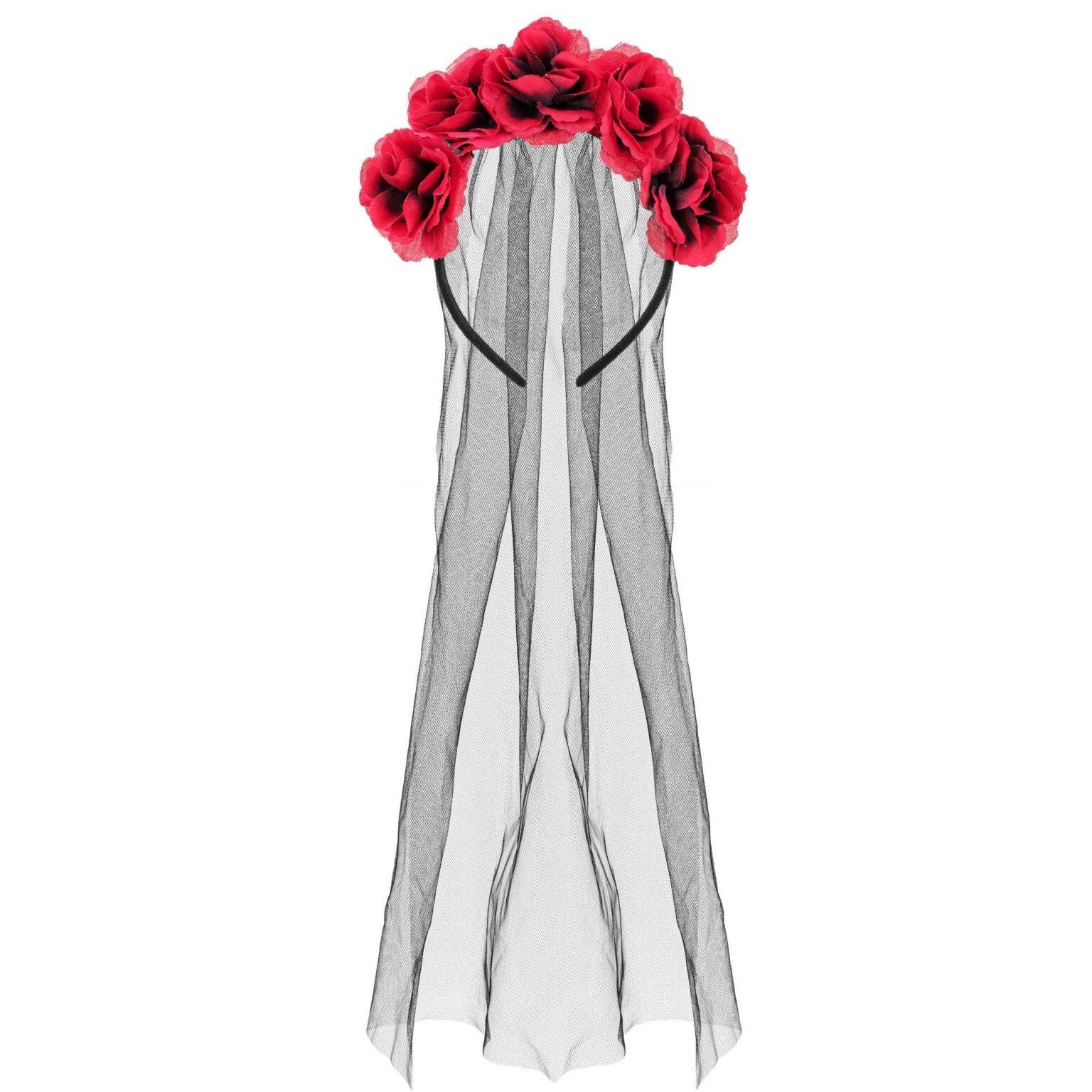 Στέκα με κόκκινα τεχνητά τριαντάφυλλα και μαύρο τούλινο πέπλο, για εντυπωσιακές μεταμφιέσεις στις Απόκριες ή το Halloween!