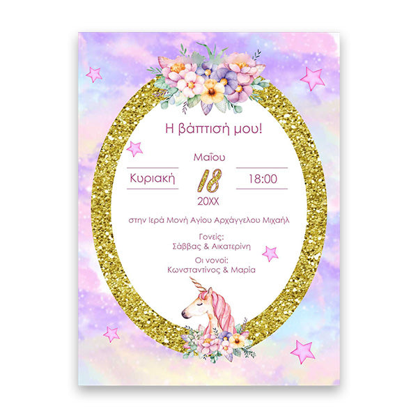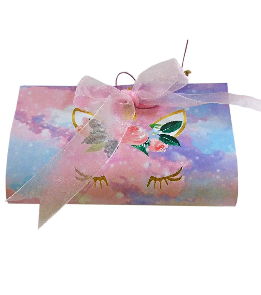 Πρωτότυπο προσκλητήριο για πάρτυ ή βάπτιση με σχέδιο φλοράλ Μονόκερο, δεμένο ως τσαντάκι.