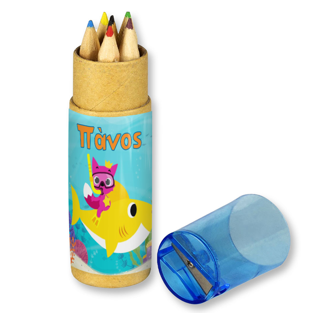 Προσωποποιημένες ξυλομπογιές σε κραφτ κουτάκι με θέμα τα αγαπημένα Καρχαριάκια, για να χαρίσετε στους καλεσμένους του πάρτυ.