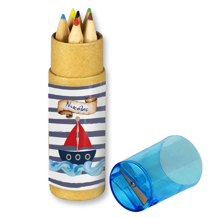 Προσωποποιημένες ξυλομπογιές σε κραφτ κουτάκι με Ναυτικό θέμα, για να χαρίσετε στους καλεσμένους σας.