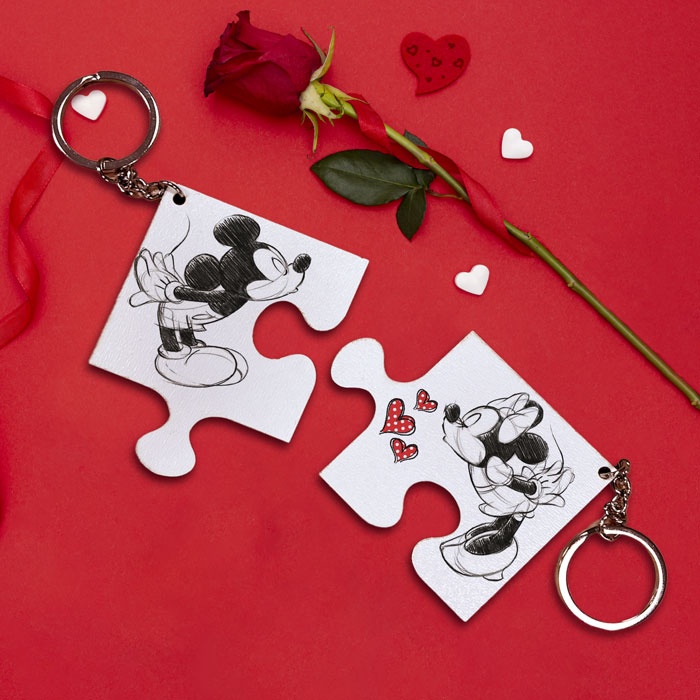 Σετ ξύλινα μπρελόκ για τα κλειδιά σε σχήμα παζλ "Mickey & Minnie in Love". Ένα έξυπνο δωράκι για ζευγάρια!
