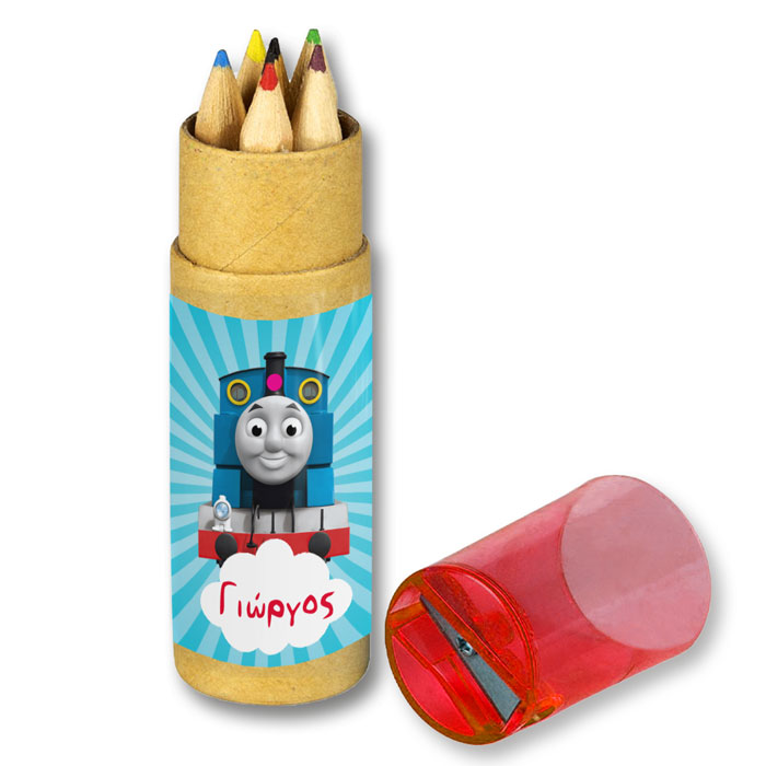 Προσωποποιημένες ξυλομπογιές σε κραφτ κουτάκι με τον Τόμας το Τρενάκι, για να χαρίσετε στους μικρούς καλεσμένους του πάρτυ.