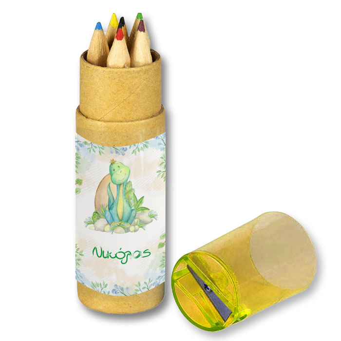 Προσωποποιημένες ξυλομπογιές σε κραφτ κουτάκι με θέμα το Δεινόσαυρο, για να χαρίσετε στους καλεσμένους.