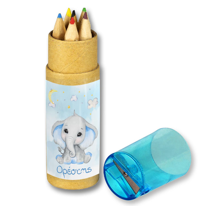 Προσωποποιημένες ξυλομπογιές σε κραφτ κουτάκι με θέμα το Ελεφαντάκι, για να χαρίσετε στους καλεσμένους ως μπομπονιέρα ή στα παιδάκια της βάπτισης ή του πάρτυ.