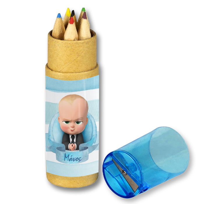 Προσωποποιημένες ξυλομπογιές σε κραφτ κουτάκι με θέμα τον σκανδαλιάρη Μπόμπιρα, για να χαρίσετε στους καλεσμένους ως μπομπονιέρα ή στα παιδάκια της βάπτισης ή του πάρτυ.