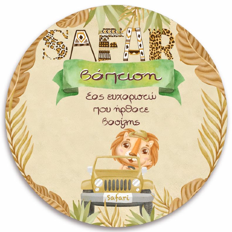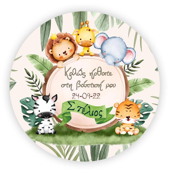 Στρογγυλή αφίσα με θέμα τα ζωάκια της ζούγκλας σε Σαφάρι και εκτυπωμένο το μήνυμα που θέλετε, για να διακοσμήσετε το χώρο της βάπτισης του μωρού σας!