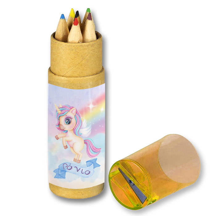 Προσωποποιημένες ξυλομπογιές σε κραφτ κουτάκι με θέμα Μονόκερο και Ουράνιο Τόξο, για να χαρίσετε στα παιδάκια του πάρτυ ως δωράκι.