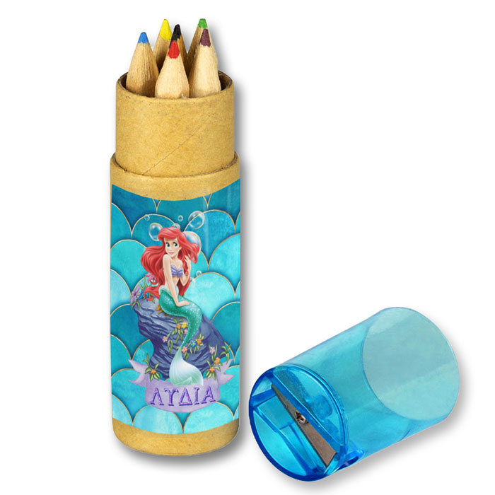 Προσωποποιημένες ξυλομπογιές σε κραφτ κουτάκι με θέμα την μικρή γοργόνα, για να χαρίσετε στους καλεσμένους του πάρτυ της μικρής σας.
