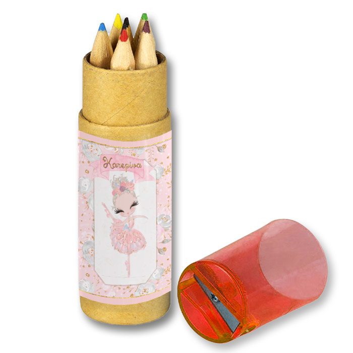 Προσωποποιημένες ξυλομπογιές σε κραφτ κουτάκι με θέμα Μπαλαρίνα, για να χαρίσετε στους καλεσμένους του πάρτυ.
