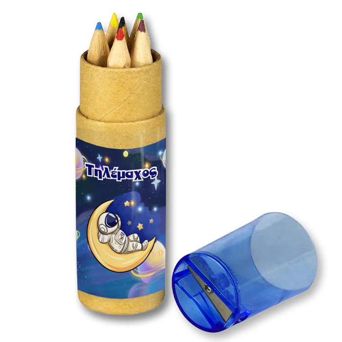 Προσωποποιημένες ξυλομπογιές σε κραφτ κουτάκι με θέμα Αστροναύτη, για να χαρίσετε στους καλεσμένους του πάρτυ.