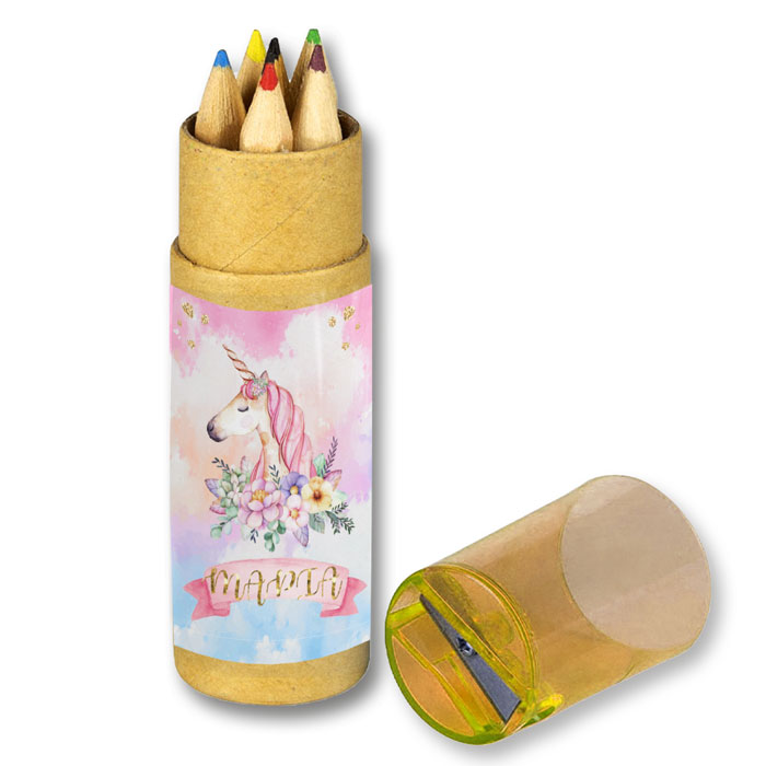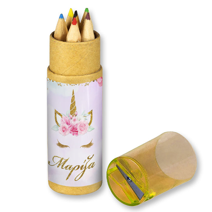 Προσωποποιημένες ξυλομπογιές σε κραφτ κουτάκι με θέμα Μονόκερο, για να χαρίσετε στους καλεσμένους του πάρτυ.