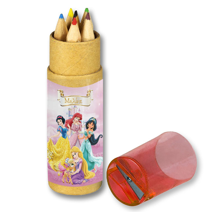 Προσωποποιημένες ξυλομπογιές σε κραφτ κουτάκι με θέμα Πριγκίπισσες, για να χαρίσετε στους καλεσμένους του πάρτυ.