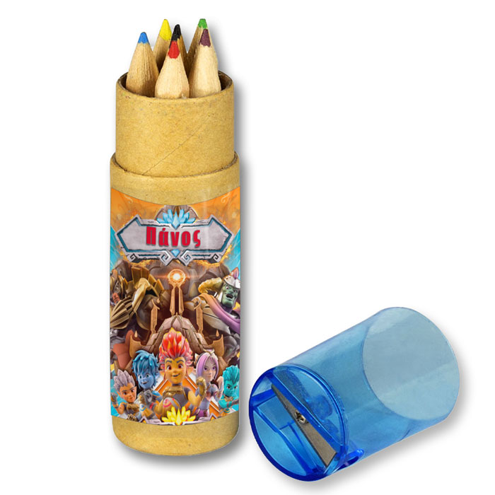 Προσωποποιημένες ξυλομπογιές σε κραφτ κουτάκι με θέμα Gormiti, για να χαρίσετε στους καλεσμένους του πάρτυ.