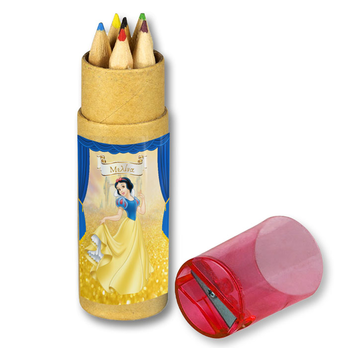 Προσωποποιημένες ξυλομπογιές σε κραφτ κουτάκι με θέμα Χιονάτη, για να χαρίσετε στους καλεσμένους του πάρτυ.