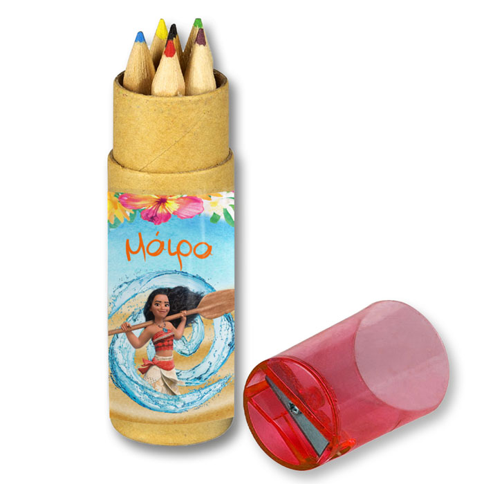 Προσωποποιημένες ξυλομπογιές σε κραφτ κουτάκι με θέμα Μοάνα, για να χαρίσετε στους καλεσμένους του πάρτυ.