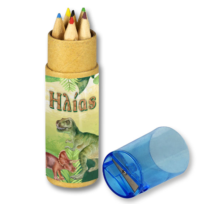 Προσωποποιημένες ξυλομπογιές σε κραφτ κουτάκι με θέμα τους Δεινόσαυρους, για να χαρίσετε στους καλεσμένους του πάρτυ.