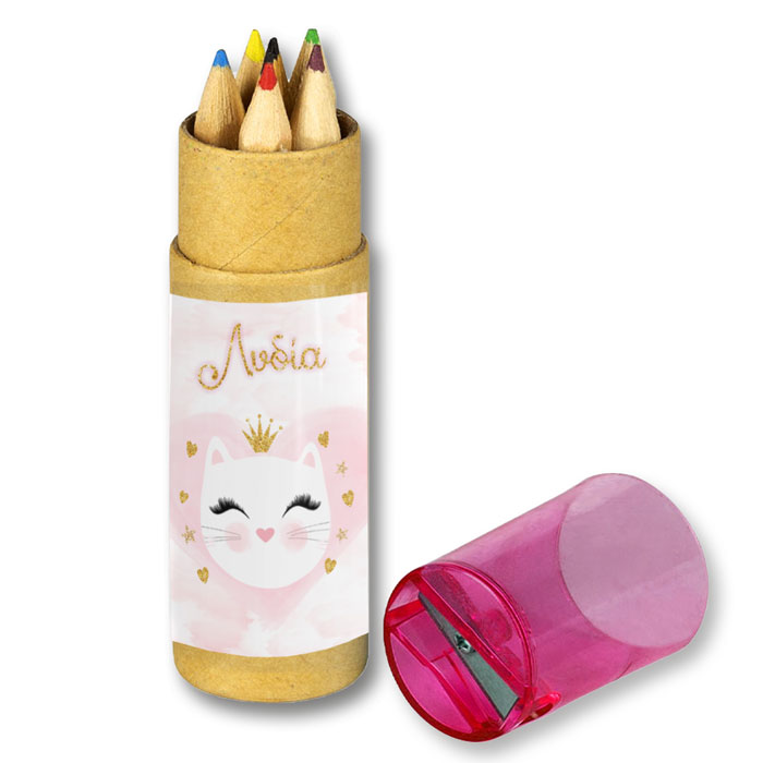 Προσωποποιημένες ξυλομπογιές σε κραφτ κουτάκι με θέμα Γατούλα, για να χαρίσετε στους καλεσμένους του πάρτυ.