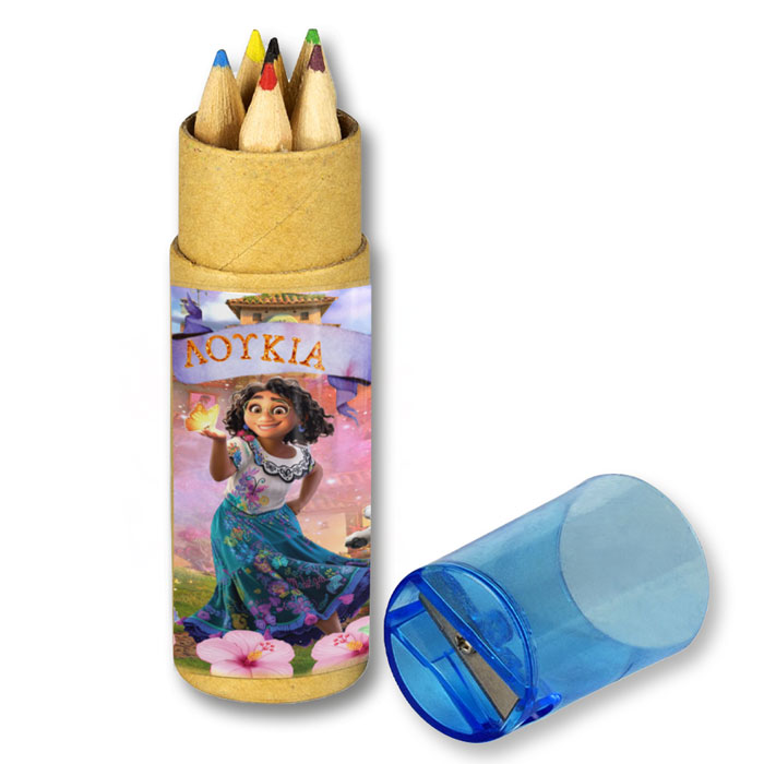 Προσωποποιημένες ξυλομπογιές με θέμα Encanto, σε κραφτ κουτάκι, για να χαρίσετε στους μικρούς καλεσμένους.