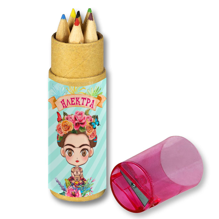 Χαρίστε στους μικρούς καλεσμένους της βάπτισης, ένα δωράκι με ξυλομπογιές στο ξεχωριστό θέμα Frida Kahlo. Μπορεί να τυπωθεί επάνω το όνομα του παιδιού.