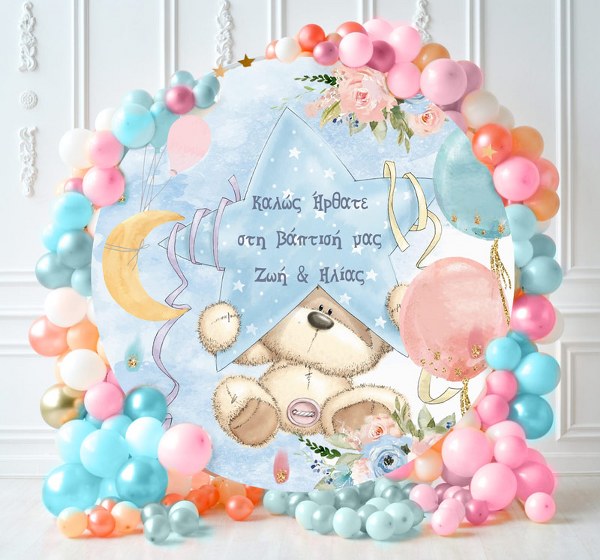 Στρογγυλή αφίσα με θέμα αρκουδάκι για τα δίδυμα μωράκια που βαπτίζονται! Εκτυπώστε το μήνυμα που θέλετε και διακοσμήστε μοναδικά το χώρο της βάπτισης!