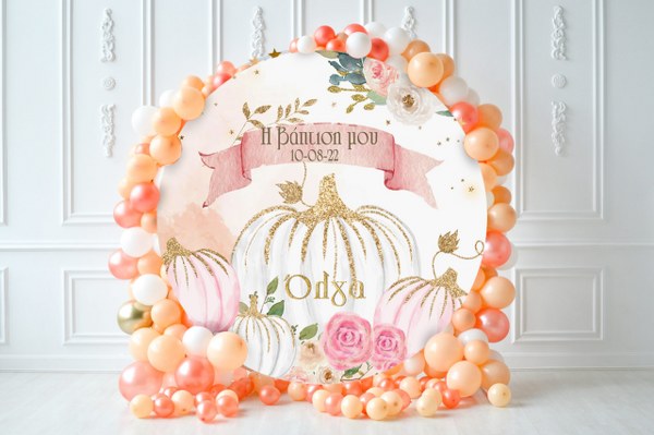 Στρογγυλή αφίσα με θέμα Κολοκύθα και εκτυπωμένο το μήνυμα που θέλετε, για να διακοσμήσετε το χώρο της βάπτισης του μωρού σας!