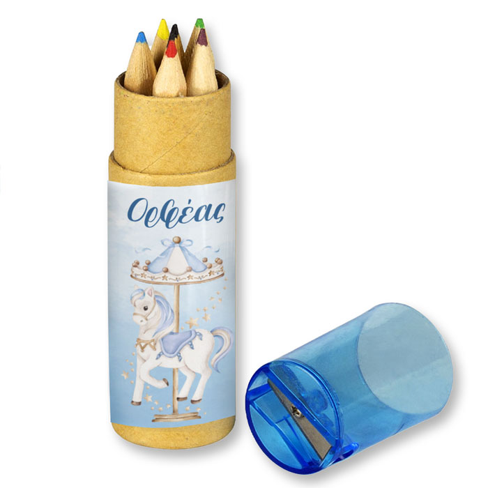 Χαρίστε στους μικρούς καλεσμένους του πάρτυ ή της βάπτισης, ένα δωράκι με ξυλομπογιές στο θέμα καρουζέλ αγόρι. Μπορεί να τυπωθεί επάνω το όνομα του παιδιού.