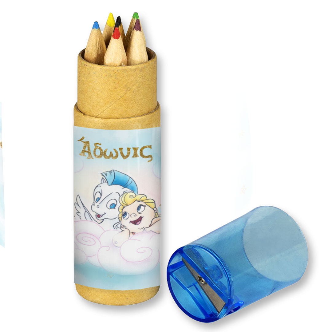 Προσωποποιημένες ξυλομπογιές σε κραφτ κουτάκι με θέμα baby Ηρακλή, για να χαρίσετε στους καλεσμένους ως μπομπονιέρα ή στα παιδάκια της βάπτισης ή του πάρτυ.