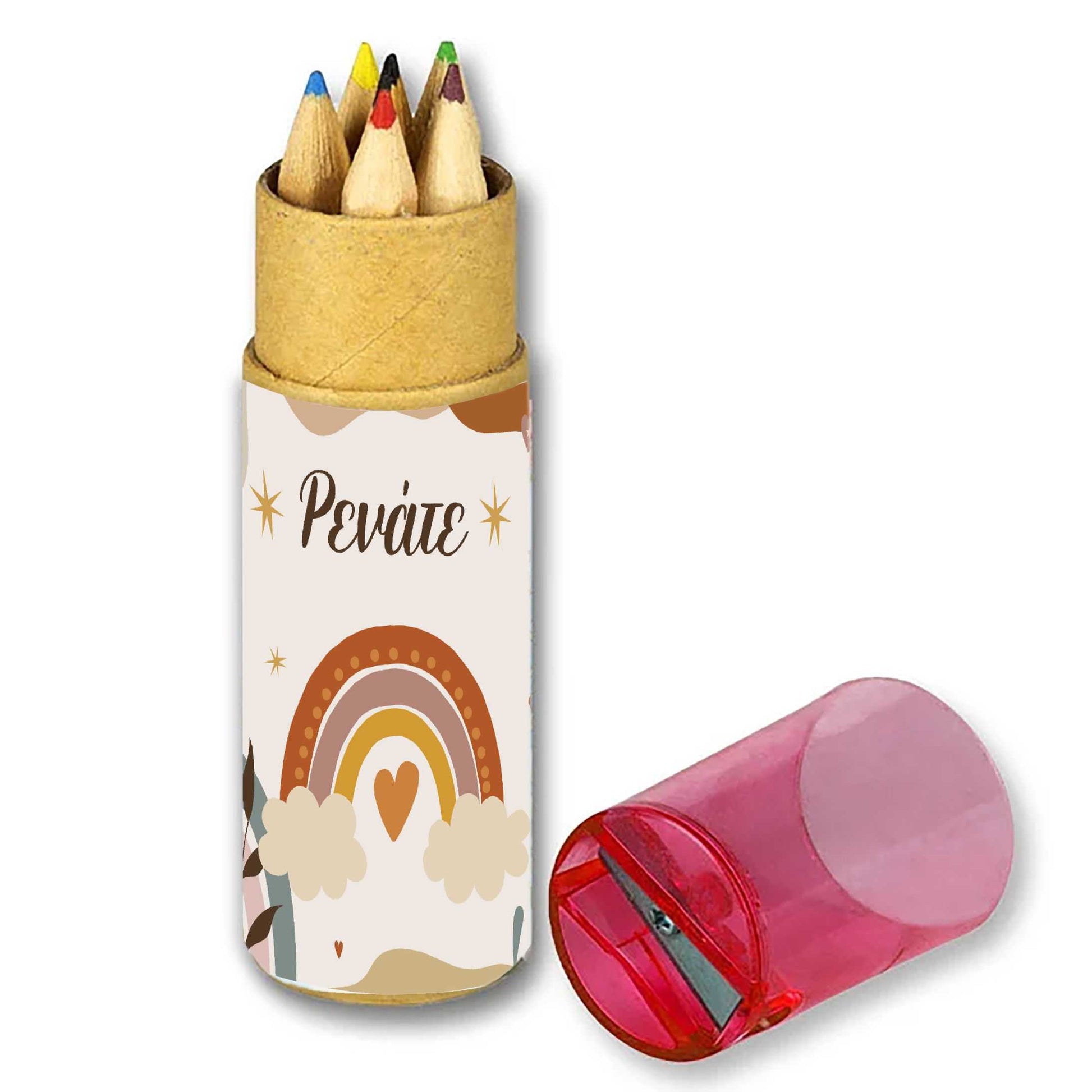 Προσωποποιημένες ξυλομπογιές σε κραφτ κουτάκι με θέμα Ουράνιο Τόξο Boho, για να χαρίσετε στους καλεσμένους ως μπομπονιέρα ή στα παιδάκια της βάπτισης ή του πάρτυ.
