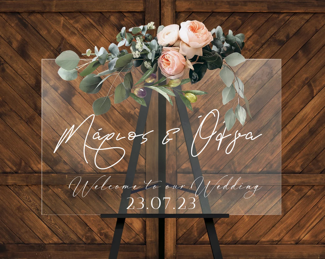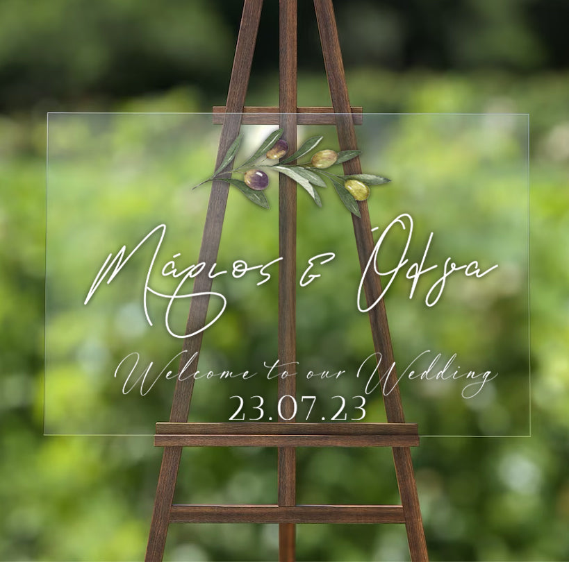 Διάφανη ακρυλική επιγραφή με θέμα την Ελιά και εκτυπωμένα τα ονόματα των νεόνυμφων. Διακόσμησέ εντυπωσιακά την είσοδο του γάμου για να καλωσορίσετε τους καλεσμένους σας!