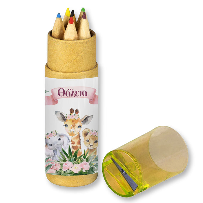 Προσωποποιημένες ξυλομπογιές σε κραφτ κουτάκι με Ζώα της Ζούγκλας Κορίτσι, να χαρίσεις στους μικρούς καλεσμένους της Βάπτισης!