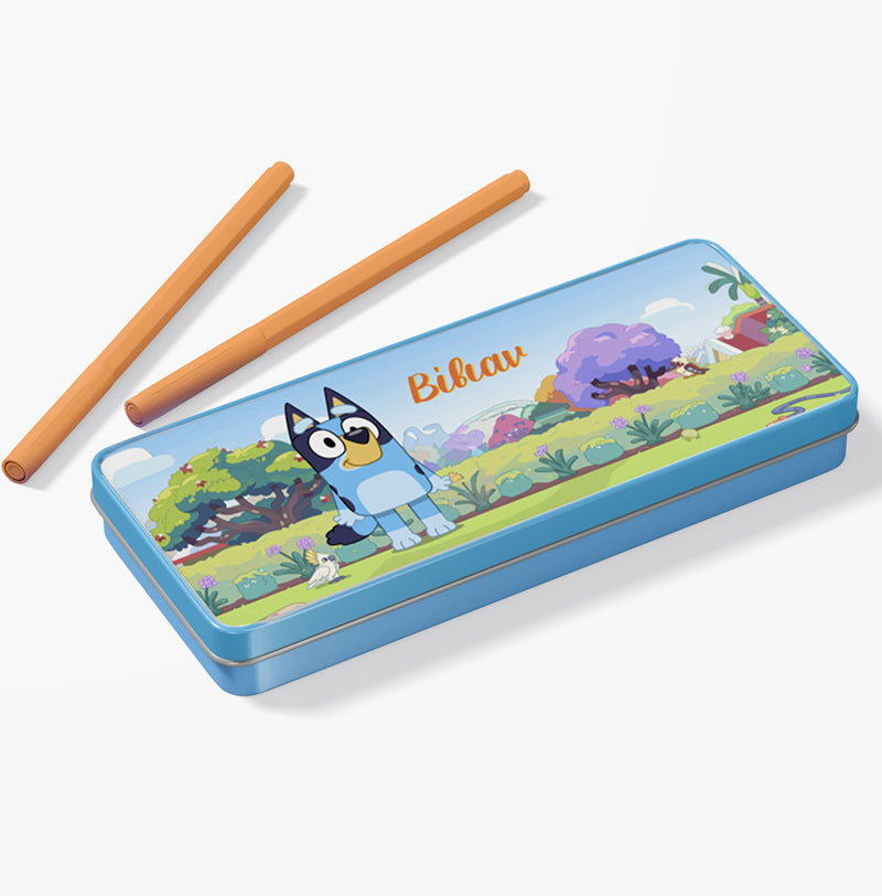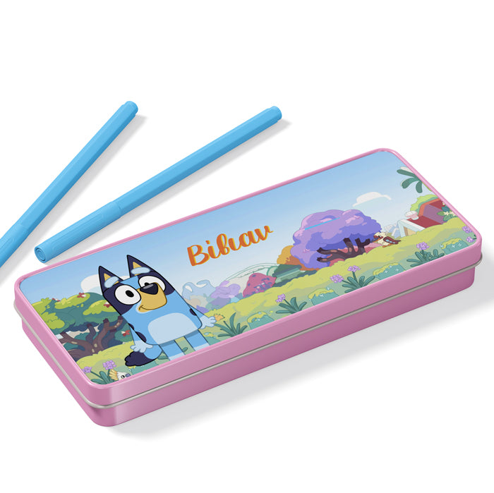 Μεταλλική κασετίνα με σχέδιο Bluey και τυπωμένο το όνομα! Βάλε σ'αυτή τα αγαπημένα σου σχολικά αντικείμενα ή δώρισέ την σε μια φίλη σου και ξεχωρίστε στην τάξη!