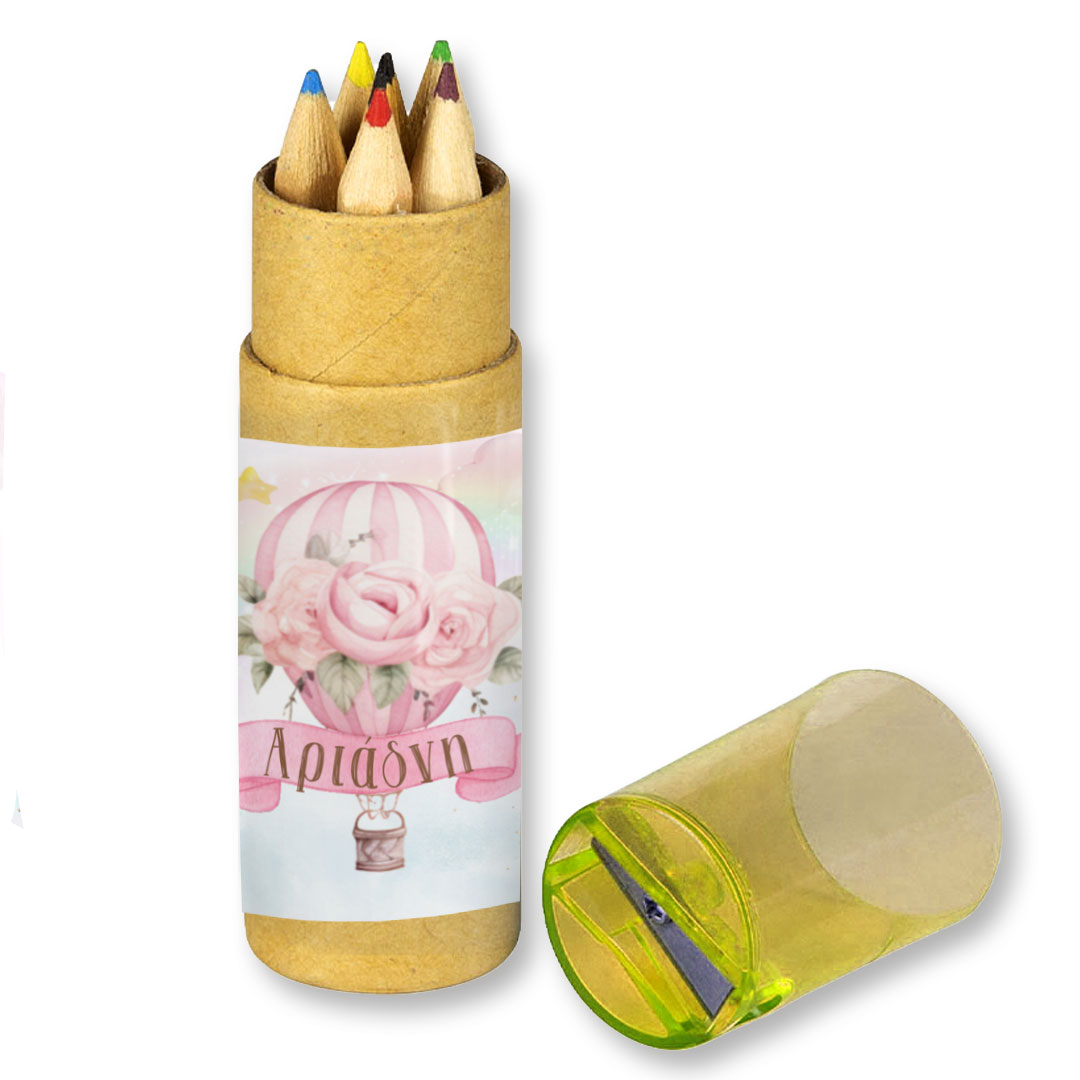 Προσωποποιημένες ξυλομπογιές σε κραφτ κουτάκι με θέμα Αερόστατο κορίτσι, για να χαρίσετε στους καλεσμένους της βάπτισης!