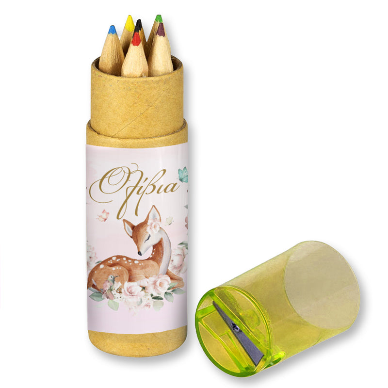 Προσωποποιημένες ξυλομπογιές σε κραφτ κουτάκι με θέμα το Ελαφάκι σε φλοράλ, για να χαρίσετε στους καλεσμένους σας!