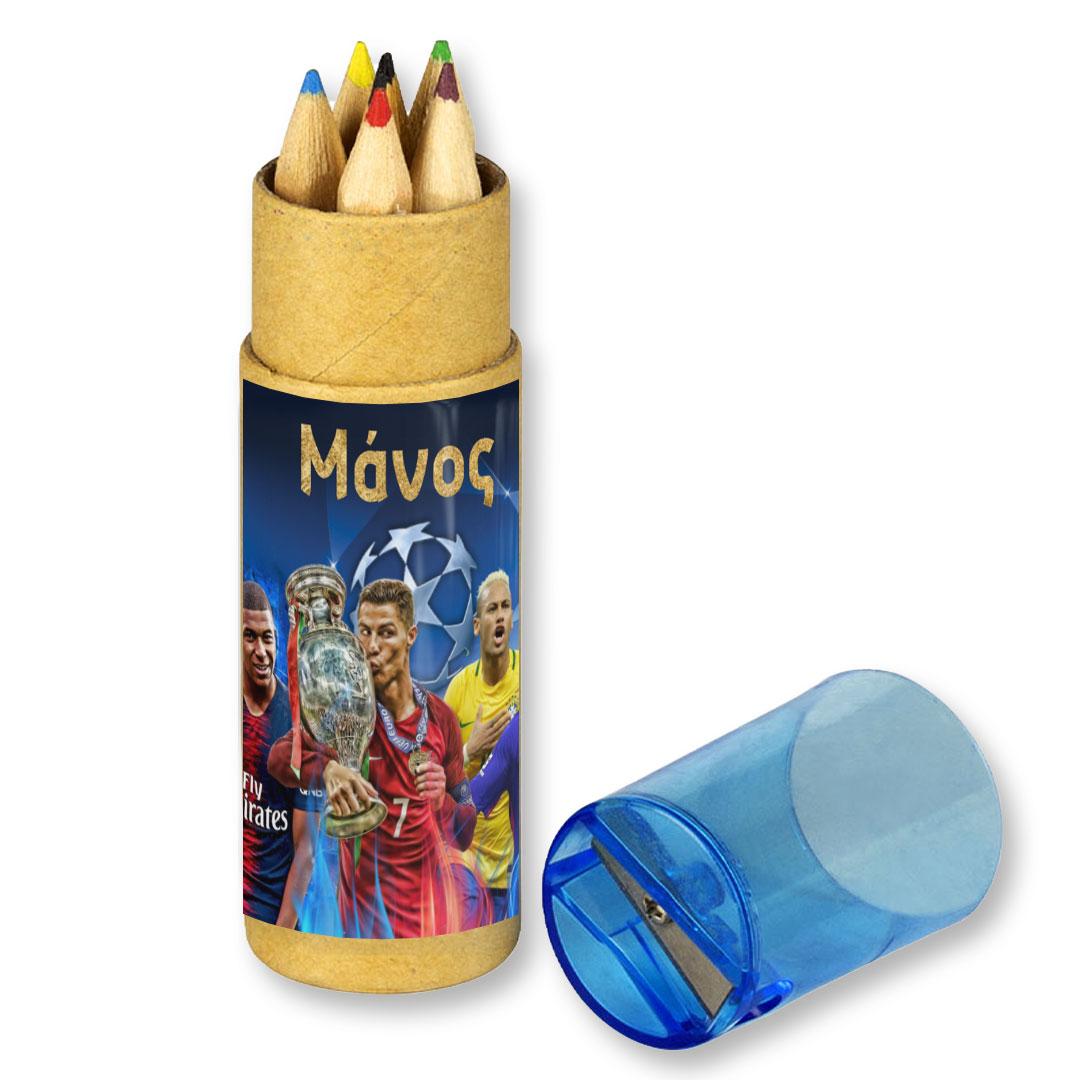 Προσωποποιημένες ξυλομπογιές σε κραφτ κουτάκι με θέμα τους άσσους του γηπέδου, για να χαρίσετε στα καλεσμένα παιδάκια του πάρτυ.