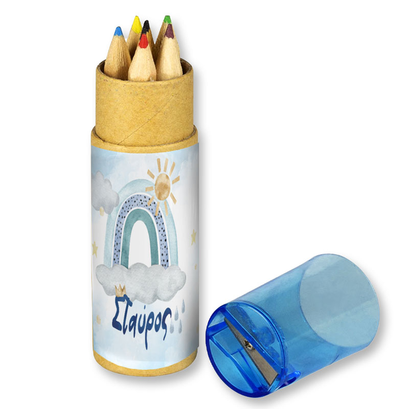 Προσωποποιημένες ξυλομπογιές σε κραφτ κουτάκι με θέμα Ουράνιο Τόξο σε αγορίστικες αποχρώσεις, για να χαρίσετε στους καλεσμένους σας!