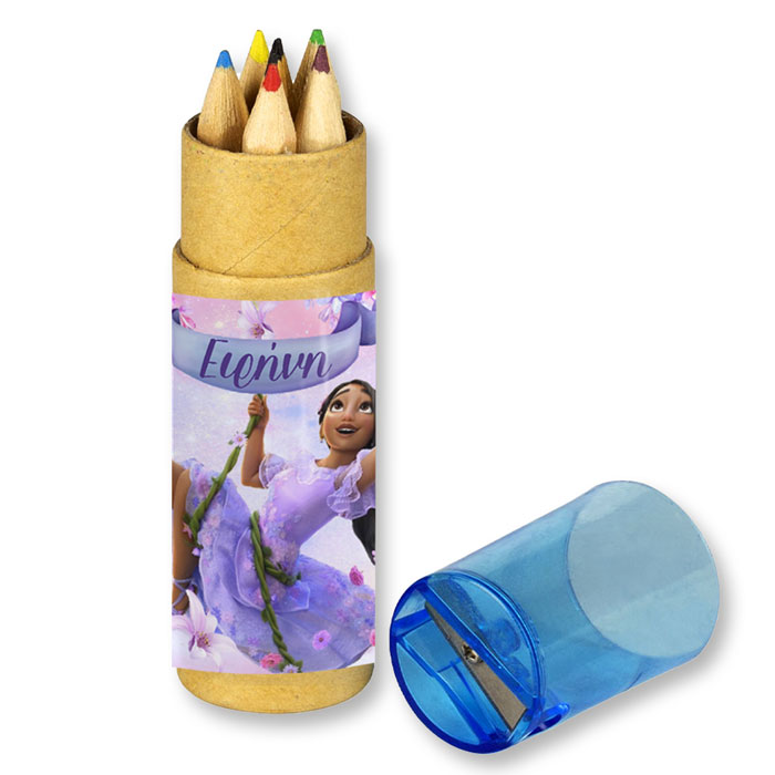 Προσωποποιημένες ξυλομπογιές με θέμα Encanto Ιζαμπέλα, σε κραφτ κουτάκι, για να χαρίσετε στους μικρούς καλεσμένους.