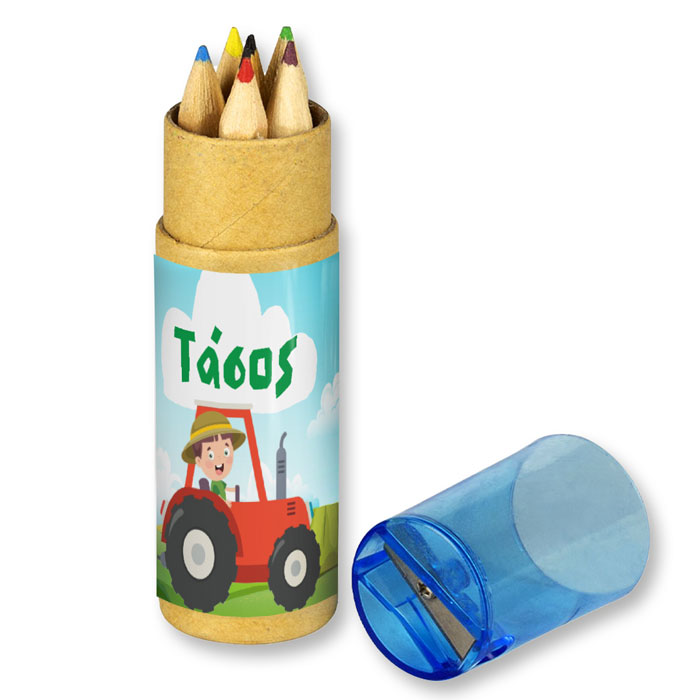 Προσωποποιημένες ξυλομπογιές σε κραφτ κουτάκι με θέμα τον Τρακτέρ, για να χαρίσετε στα καλεσμένα παιδάκια του πάρτυ.