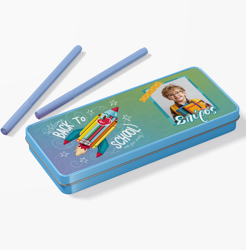 Μεταλλική γαλάζια κασετίνα Back to School με τυπωμένο το όνομα και την φωτογραφία σου! Βάλε σ'αυτή τα αγαπημένα σου σχολικά αντικείμενα ή δώρισέ την σε μια φίλη σου και ξεχωρίστε στην τάξη!