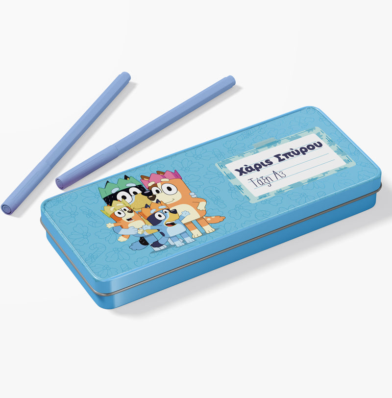 Μεταλλική γαλάζια κασετίνα με σχέδιο Bluey και τυπωμένο το όνομα! Βάλε σ'αυτή τα αγαπημένα σου σχολικά αντικείμενα ή δώρισέ την σε μια φίλη σου και ξεχωρίστε στην τάξη!