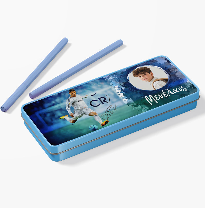 Μεταλλική γαλάζια κασετίνα Ronaldo με τυπωμένο το όνομα και την φωτογραφία σου! Βάλε σ'αυτή τα αγαπημένα σου σχολικά αντικείμενα ή δώρισέ την σε μια φίλη σου και ξεχωρίστε στην τάξη!