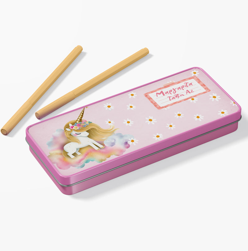 Μεταλλική ροζ κασετίνα με σχέδιο Μονόκερο και τυπωμένο το όνομα! Βάλε σ'αυτή τα αγαπημένα σου σχολικά αντικείμενα ή δώρισέ την σε μια φίλη σου και ξεχωρίστε στην τάξη!