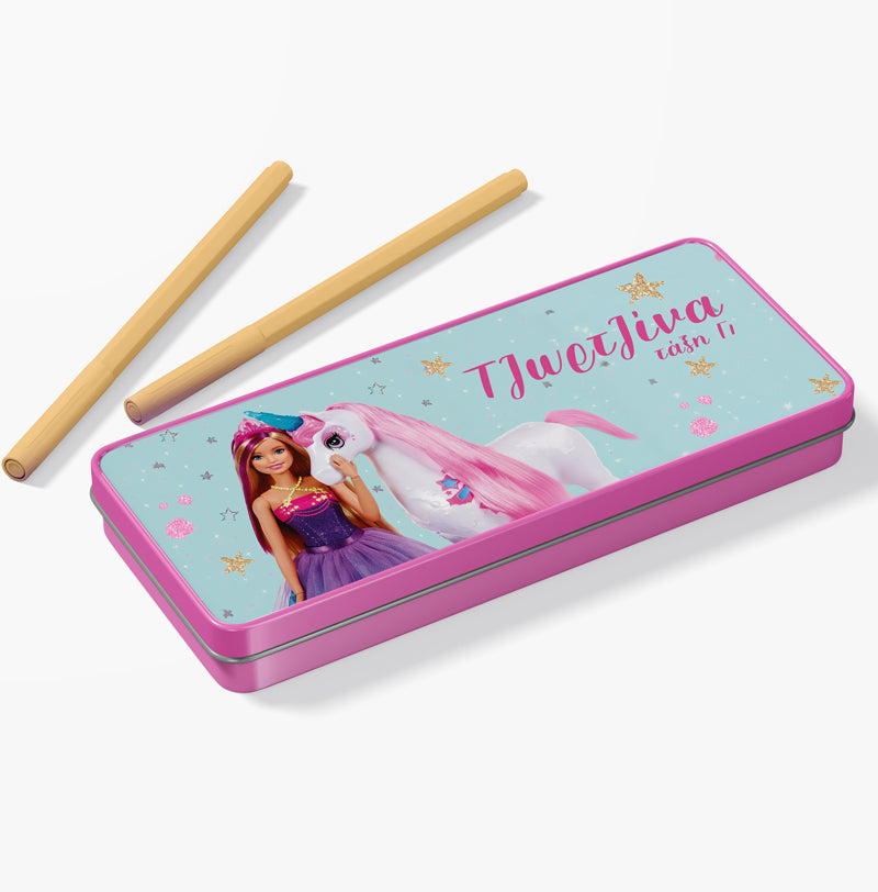 Μεταλλική ροζ κασετίνα με σχέδιο Barbie Dreamtopia και τυπωμένο το όνομα! Βάλε σ'αυτή τα αγαπημένα σου σχολικά αντικείμενα ή δώρισέ την σε μια φίλη σου και ξεχωρίστε στην τάξη!